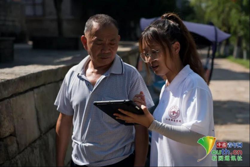 图为队员们给流坑村村民观看三维导览图。