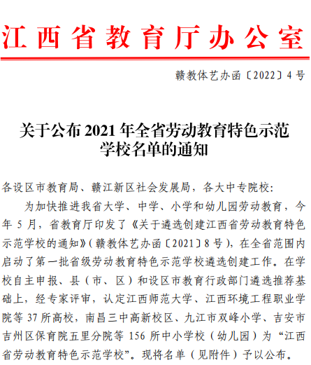 近日,江西省教育厅发布了《关于公布2021年全省劳动教育特色示范学校名单的通知》(赣教体艺办函〔2022〕4号),共37所高校遴选为全省劳动教育特色示范学校,我校位列其中。